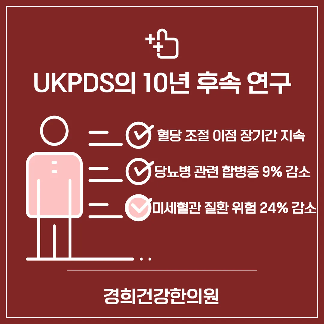 추가적으로, UKPDS의 10년 후속 연구에서는 초기 집중적인 혈당 조절의 이점이 장기간 지속되어, 모든 당뇨병 관련 합병증 위험이 9%, 미세혈관 질환 위험이 24% 감소하는 등 '유산 효과'가 확인되었습니다.