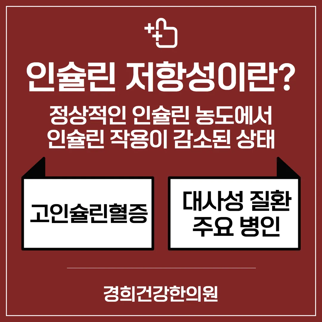 인슐린 저항성은 혈당 조절 실패와 대사성 질환의 핵심 원인이며, 복부 비만과 고중성지방혈증을 포함한 대사증후군과 연관됩니다.