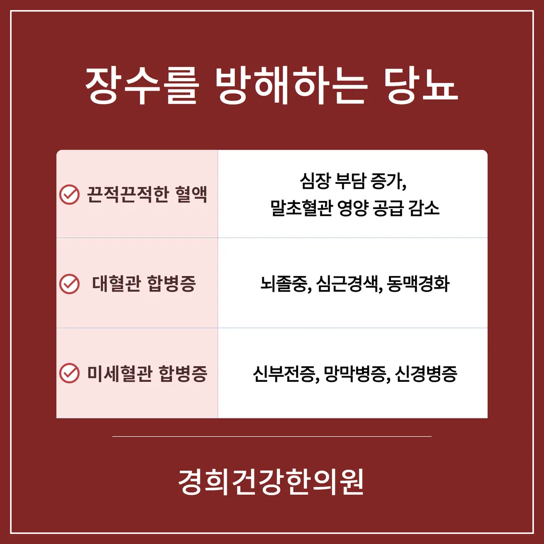 혈액 속에 당분이 많아지면 혈액이 끈적끈적해져 흐름이 느려집니다. 이로 인해 다음과 같은 문제가 발생할 수 있습니다.