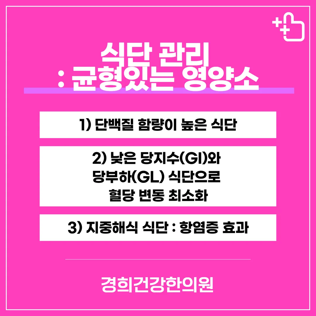 2. 식단 관리: 균형 잡힌 영양소 섭취와 혈당 변동 최소화