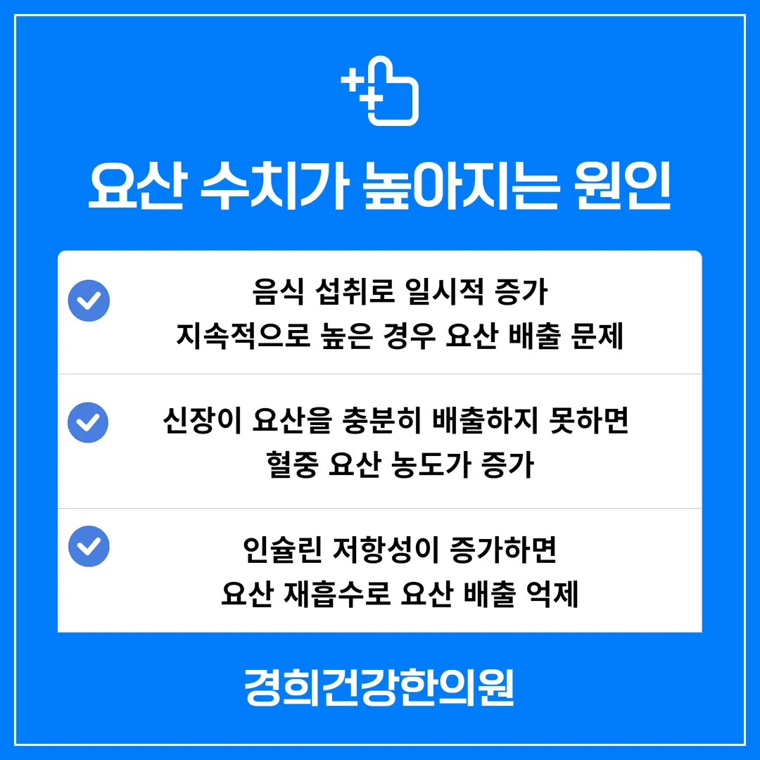 요산 수치가 높아질 경우 인슐린 저항성이 증가하고, 신장 기능 저하 및 통풍과 같은 질환의 위험이 높아질 수 있습니다.
