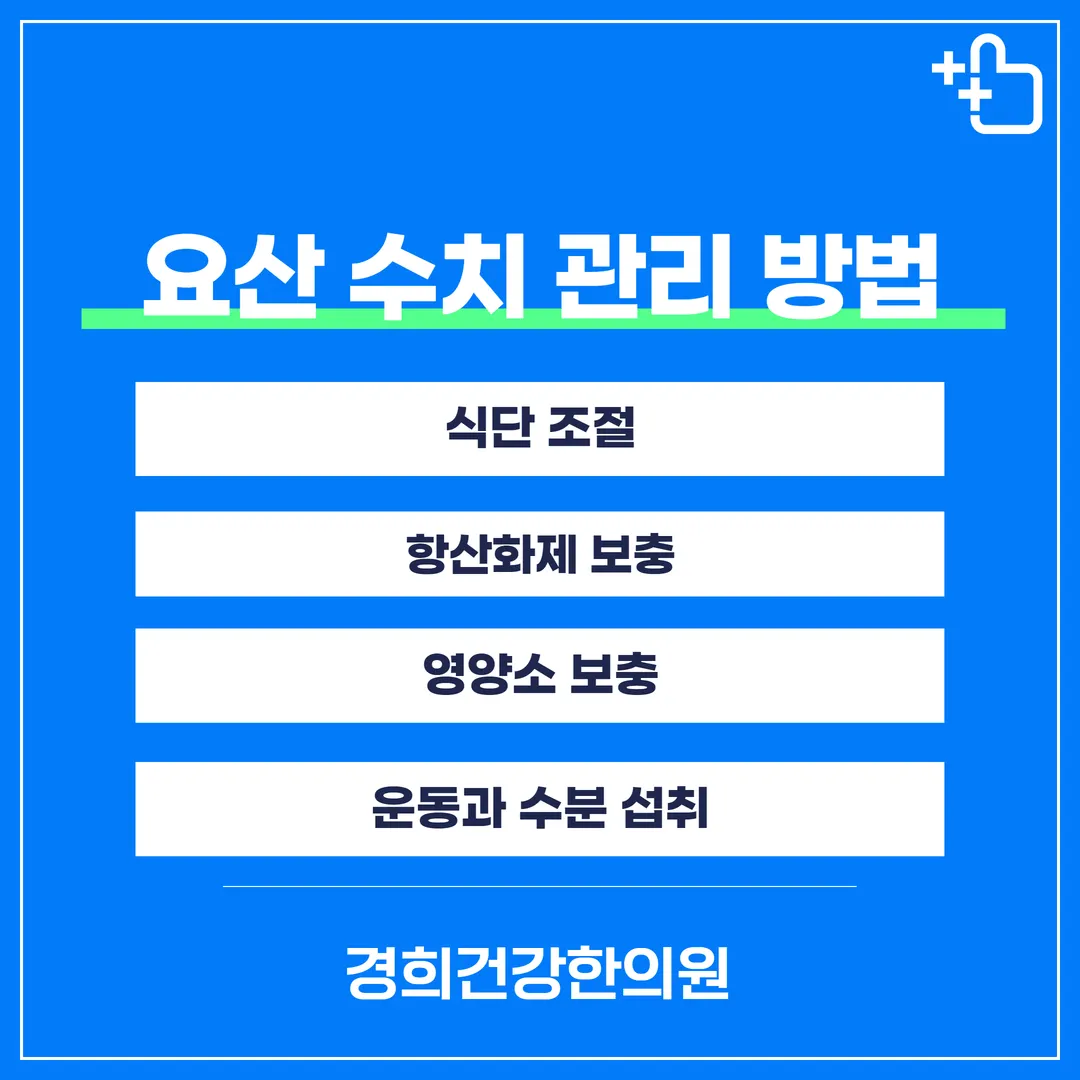 규칙적인 운동과 충분한 수분 섭취는 요산 배출을 촉진합니다.